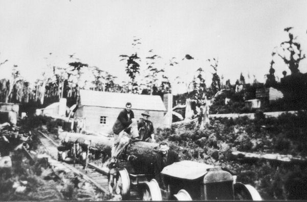 Men carting in a log at the Salmon River sawmill at Redpa, Tasmania